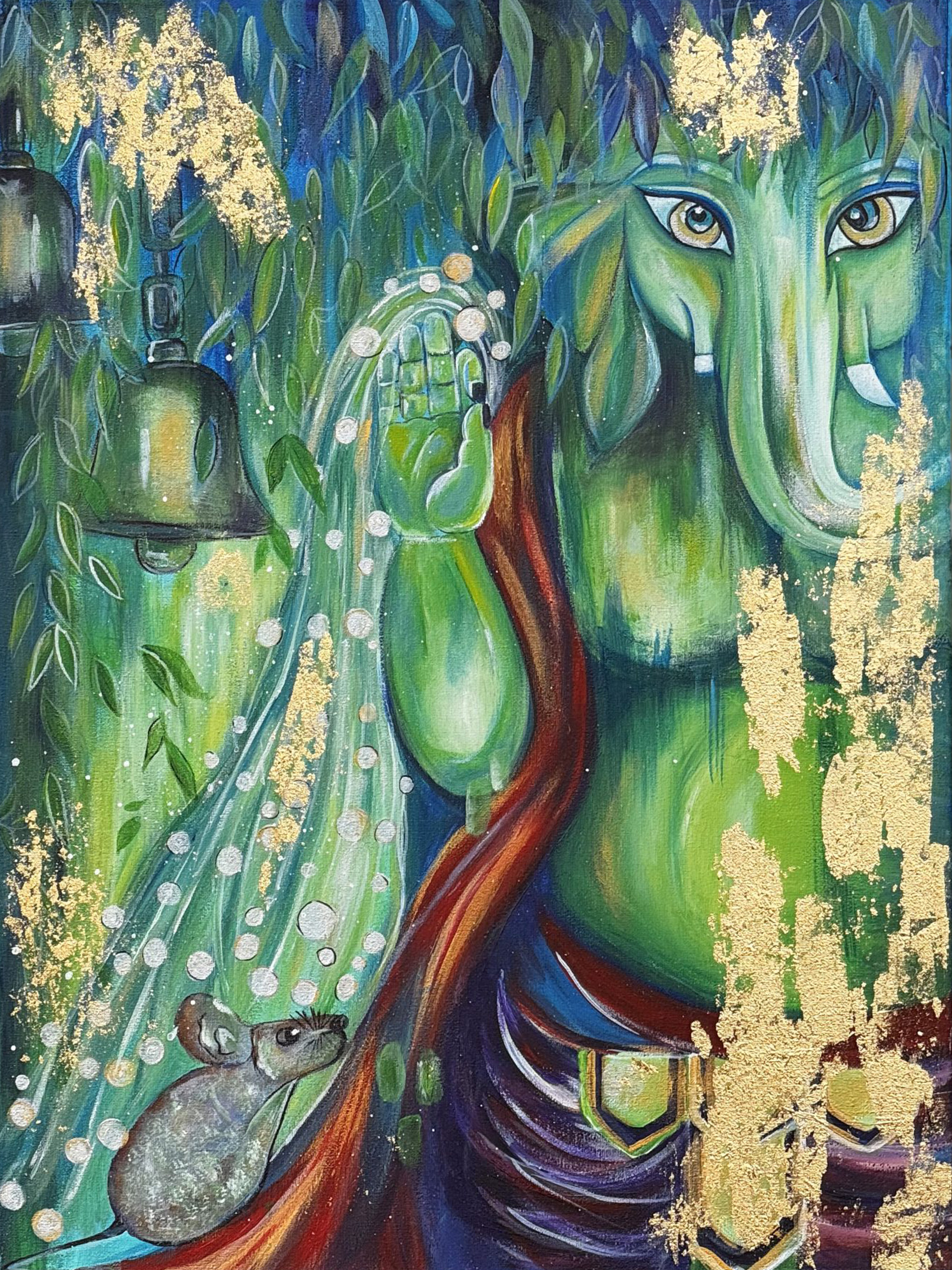 This vibrant canvas features Lord Ganesha, partially concealed behind lush leaves, extending a hand that showers coins as a symbol of divine blessing and prosperity. Beneath him, his beloved mouse looks up with affection, adding a touch of endearing devotion. The background, a rich blend of green, blue, and gold, is adorned with bells and conveys a sense of movement and energy. This artwork exudes themes of prosperity, peace, growth, stability, power, and love, capturing Ganesha’s role as a bringer of blessings and harmony.