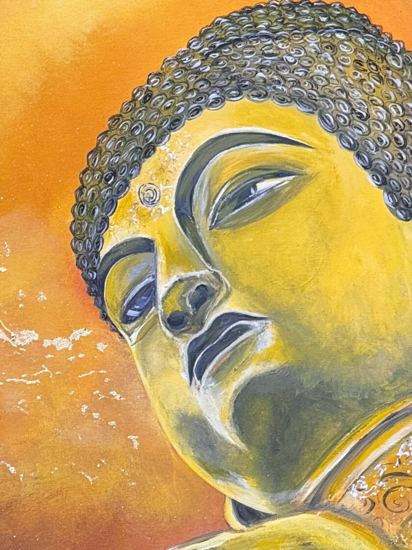 This large painting portrays a Buddha seated in a profound meditative pose, embodying calm and serenity. The background, inspired by the sunrise, is a soothing blend of yellow, cadmium white, and warm browns, capturing the gentle light of dawn. Gold leaf accents mimic the sun’s rays, radiating from the top corner and embracing the meditating Buddha. The artwork exudes a sense of peace and positivity, inviting viewers to experience a moment of tranquility and inner harmony.